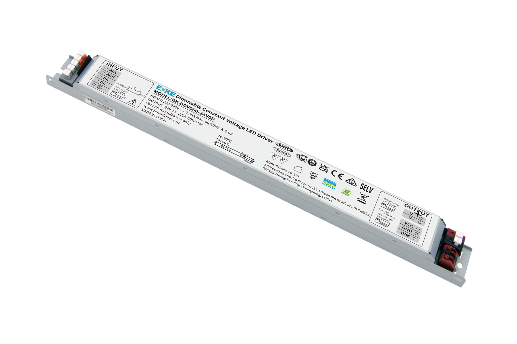 The BOKE BK-DGV Series is a DALI DT6-compatible constant voltage linear dimmable LED driver, designed for smooth dimming, high efficiency, and advanced control integration.