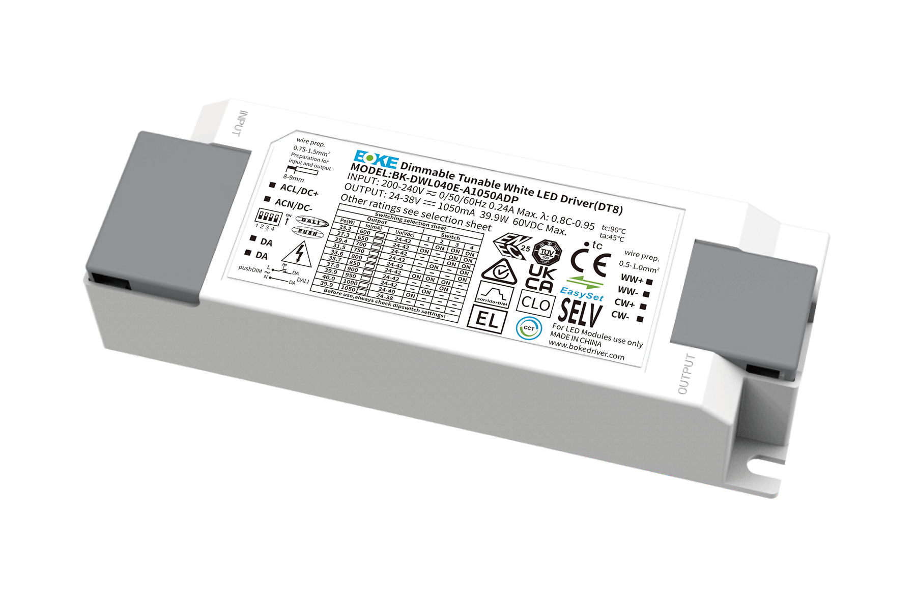 The BOKE BK-DWL Series is a high-performance constant current DALI-2 DT8 dimmable LED driver, designed for tunable white lighting applications. It ensures smooth dimming and reliable operation across various residential and commercial lighting environments.